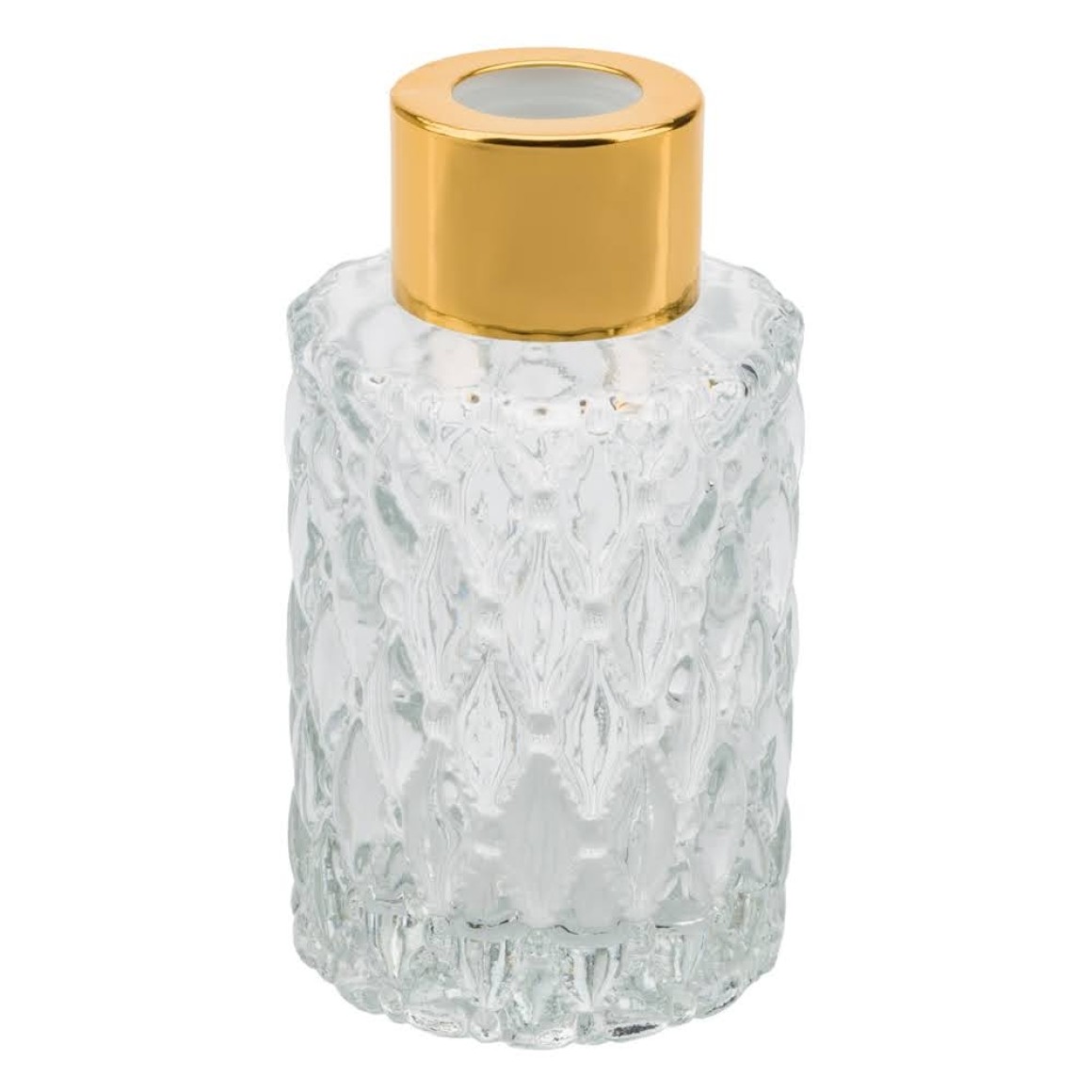 Frasco de vidro Com Tampa Dourada para aromatizador, 80ml. Detalhes no corpo do frasco de losango e bolinha.